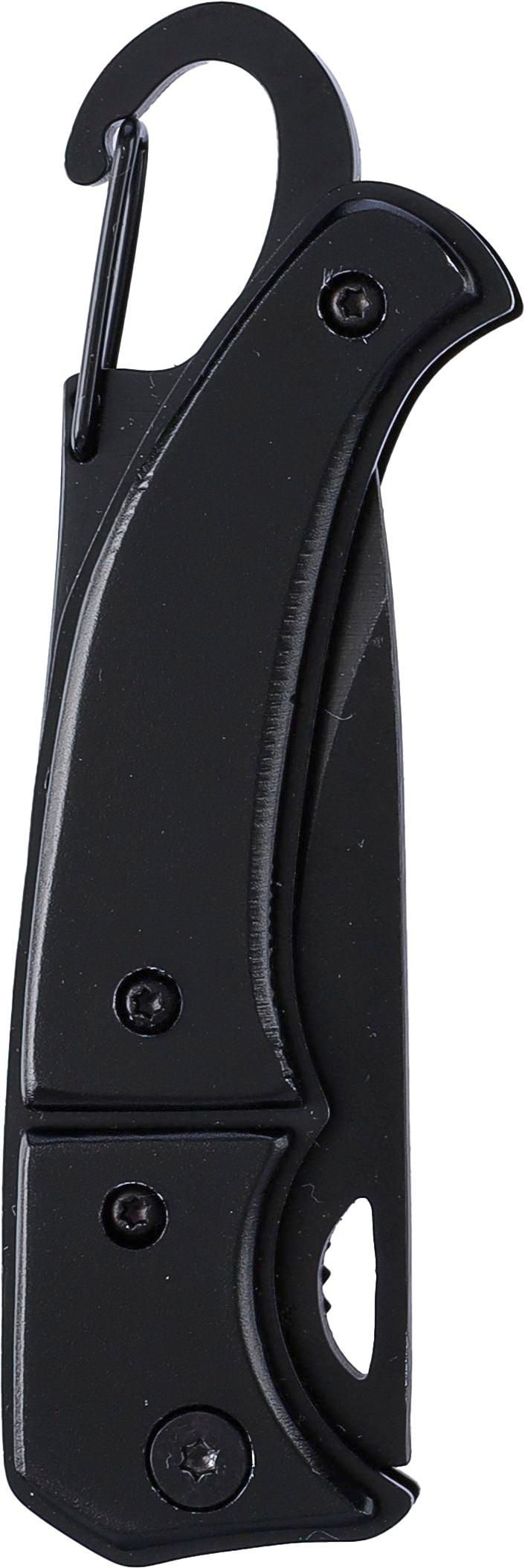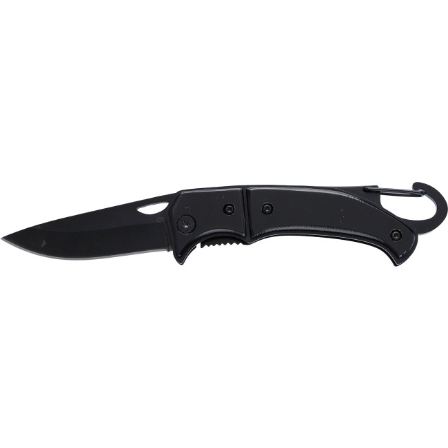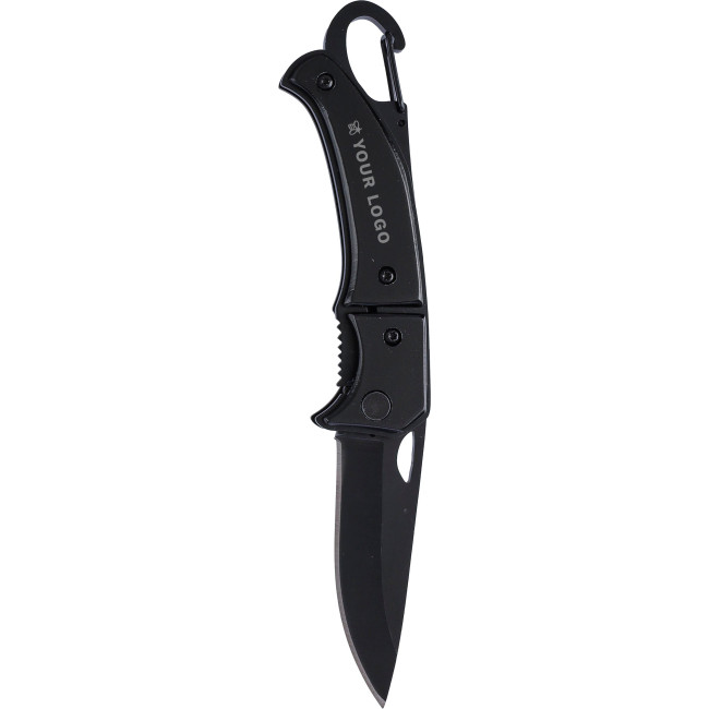 Coltellino tascabile in acciaio inox con blocco di sicurezza, impugnatura in alluminio e moschettone in metallo, confezionato singolarmente in una scatola in cartone avana. Dichiarazione di non responsabilità: moschettone non adatto all'arrampicata.