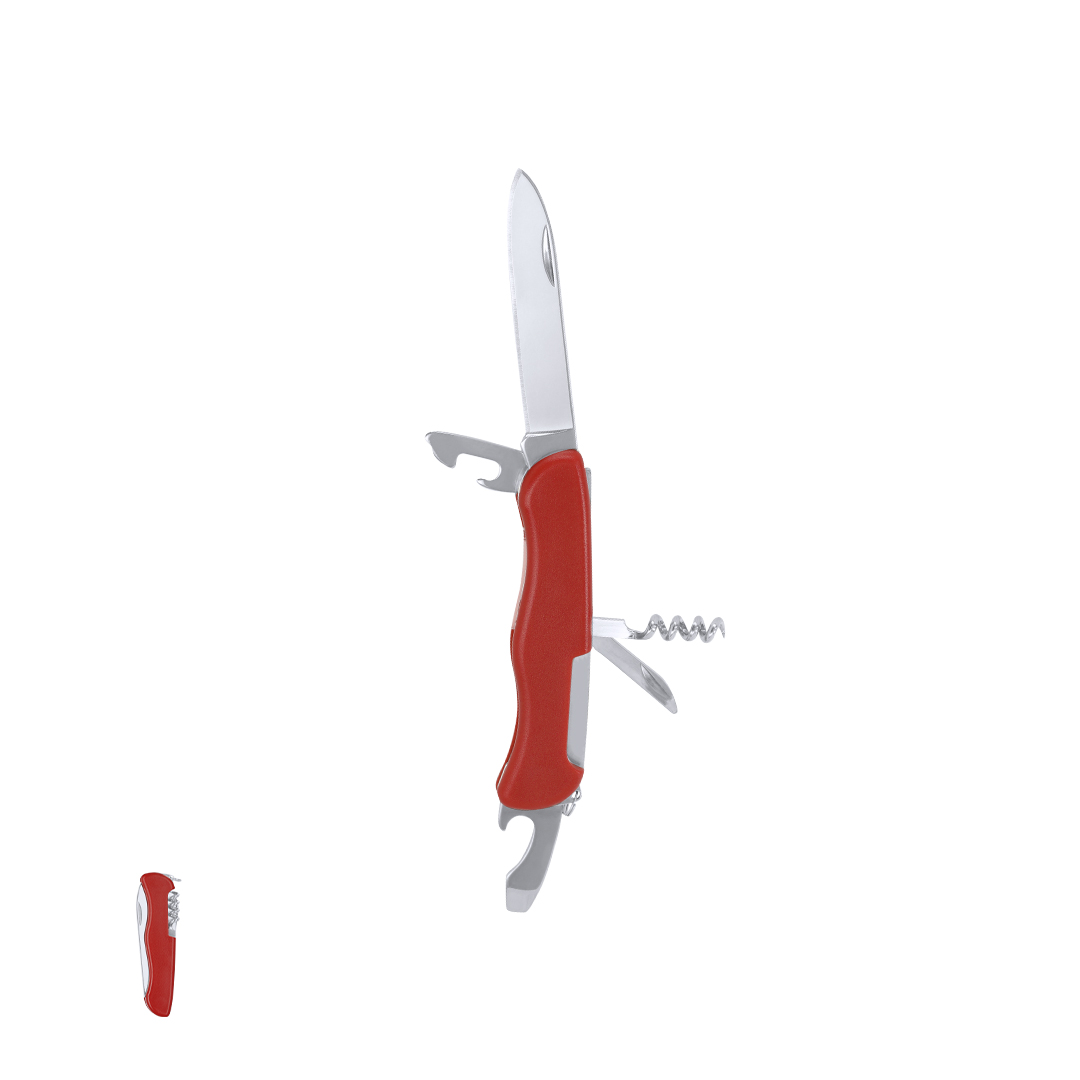Coltello multiuso Lixthel progettato per offrire versatilità e praticità. Dotato di 5 funzioni essenziali: coltello, punteruolo, cavatappi, apribottiglie e apriscatole. Il rivestimento in ABS resistente garantisce durabilità e un'ottima presa. Questo strumento è ideale per chi cerca un accessorio compatto e funzionale, personalizzabile con logo per un tocco distintivo.