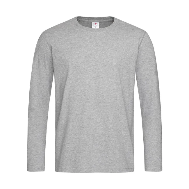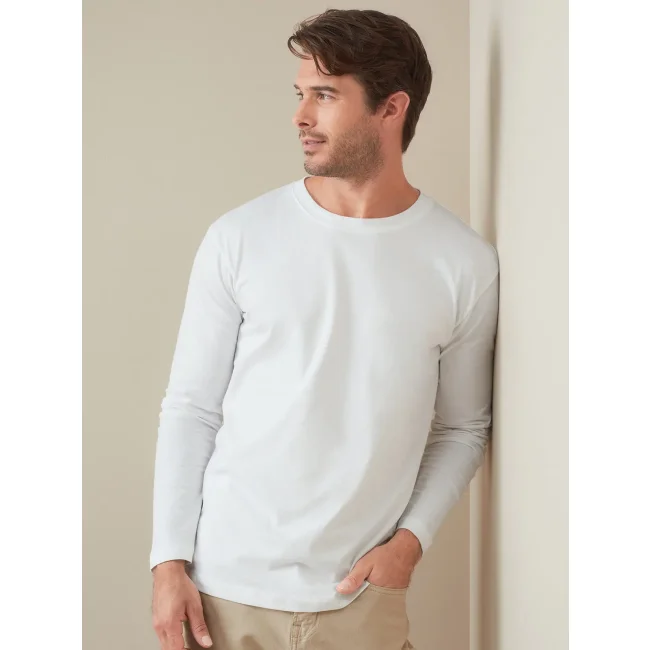 100% cotone ring-spun, single jersey. T-shirt manica lunga set-in, girocollo, struttura con busto tubolare, nastro di rinforzo alle spalle, maniche senza polsini. Col. GYH: 85% cot. 15% vis.