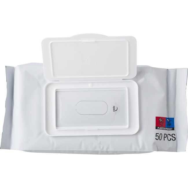 Confezione salviette detergenti in custodia sigillata, contiene 50 salviette, alcol 75%, utile sia per le mani che per le superfici. Scade il 30 aprile 2024