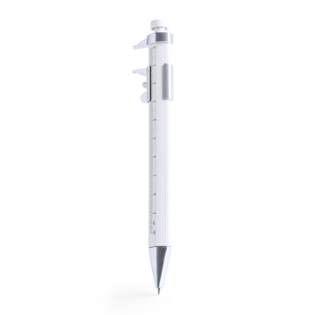 Penna con calibro e meccanismo a rotazione. Con righello integrato nel corpo da 10 cm. Inchiostro blu.