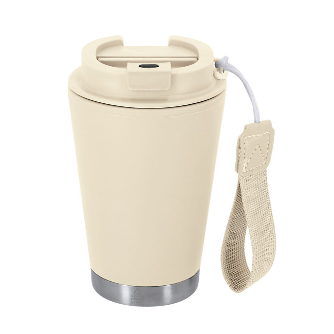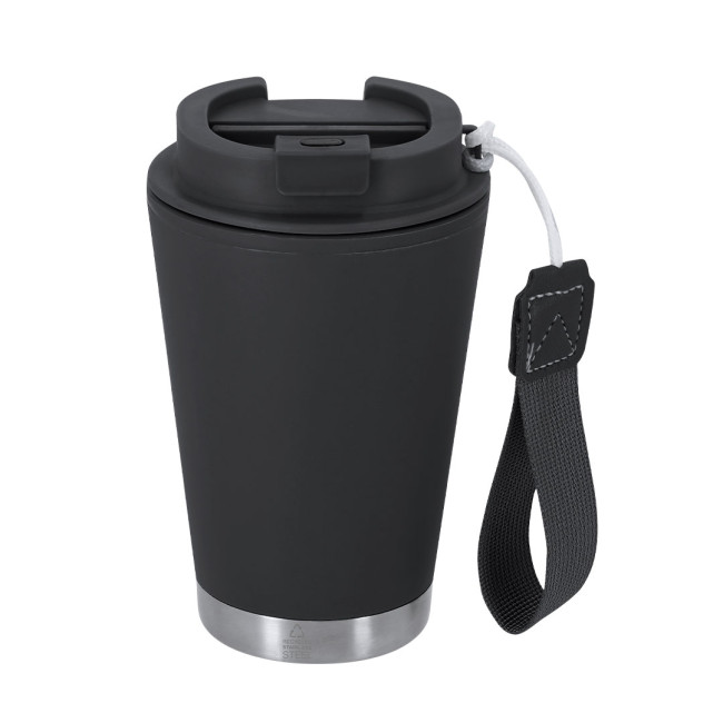 Coppa termica con capacità di 300 ml, realizzata in acciaio inossidabile riciclato e PP riciclato con doppia parete. Dotata di un coperchio di sicurezza per una chiusura ermetica e un manico in poliestere per un trasporto facile, questo prodotto è BPA-free e rappresenta una scelta ecologica.