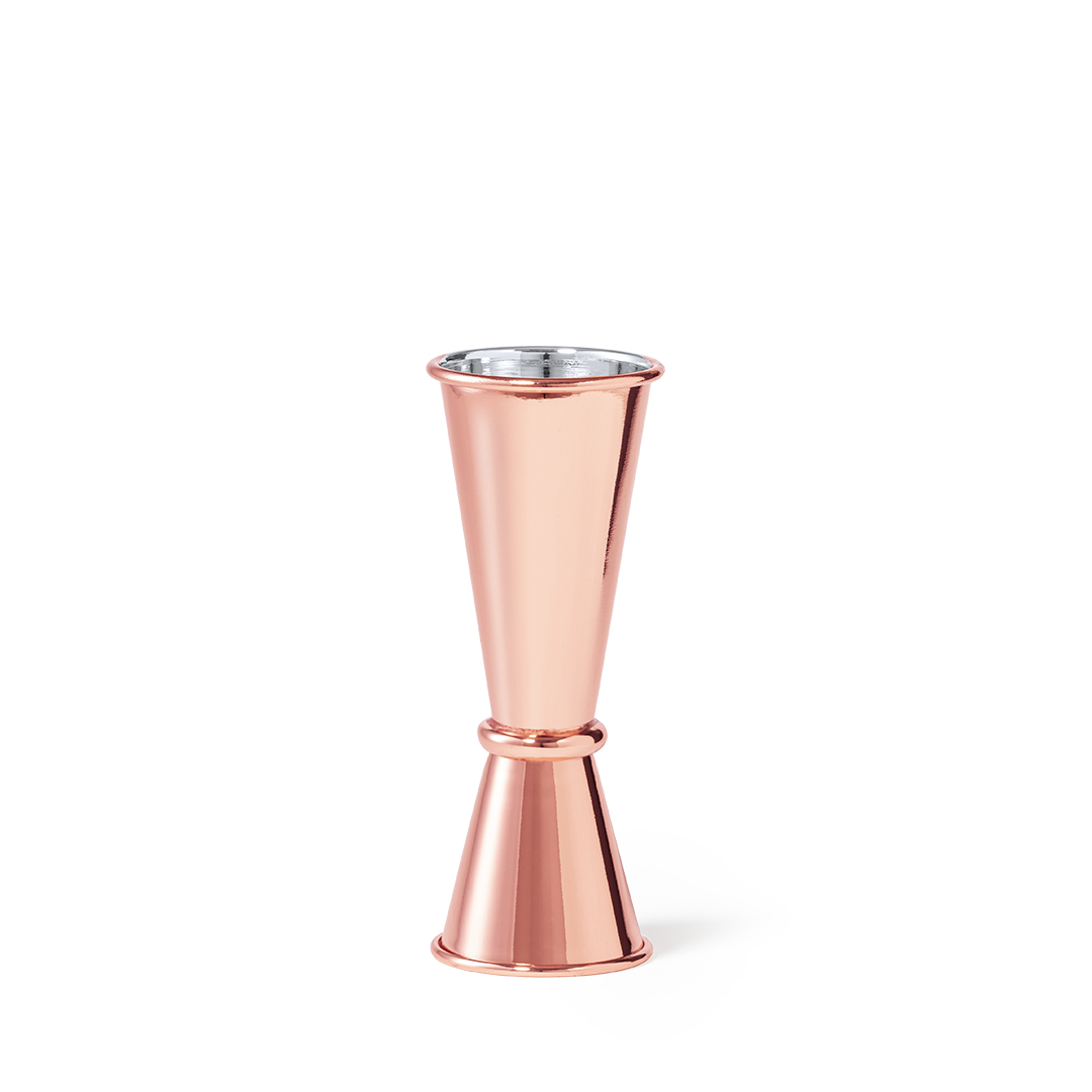 Misurini per bevande in acciaio inox con rivestimento esterno in rame galvanizzato. 2 misure: singolo da 25 ml e doppio da 50 ml. Presentato in unattraente scatola dal design individuale.