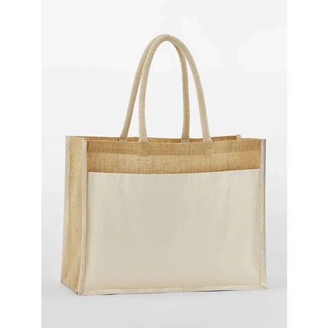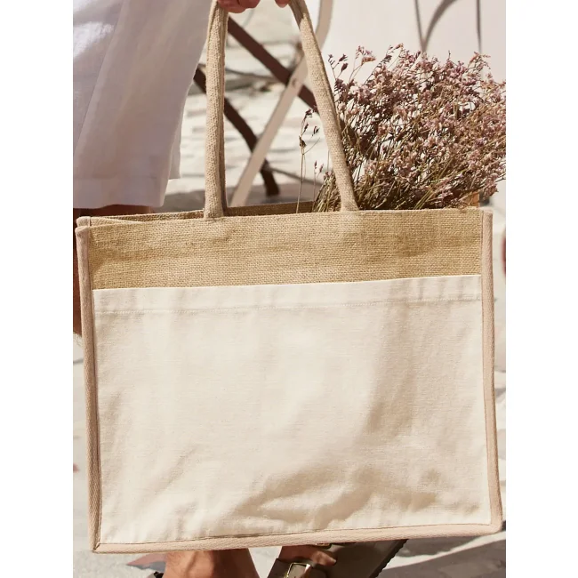 100% Juta . Borsa con manici in cotone Canvas e tasca frontale stampabile. Lunghezza manico: 55 cm Dimensioni: 42x33x19 Capacità: 21 litri. Area stampabile: 36x22 cm. Etichetta strappabile.