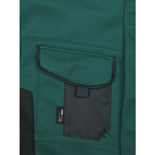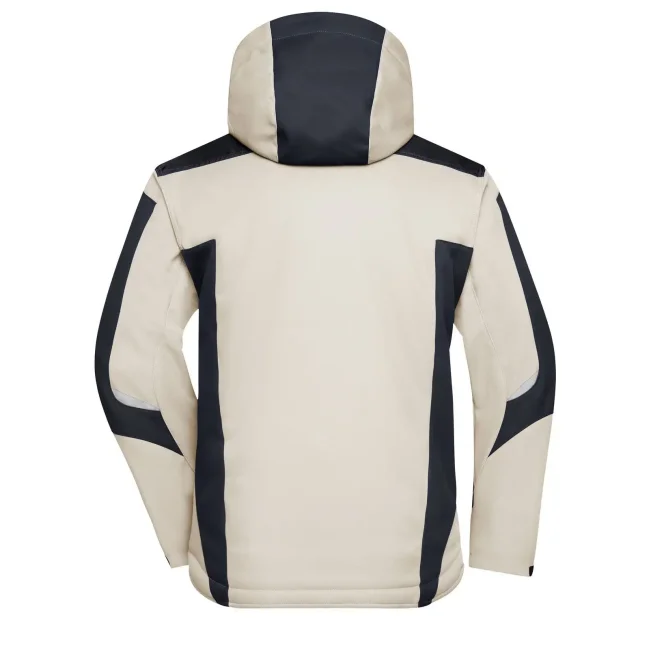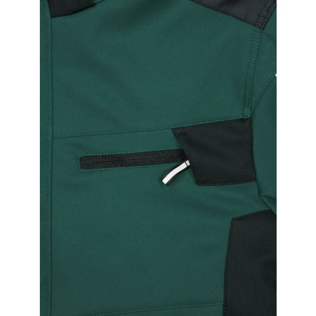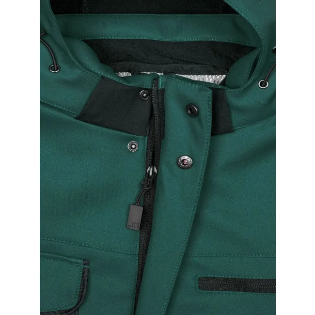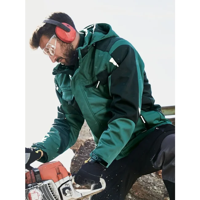 100% poliestere. Giacca in softshell professionale con caldo rivestimento interno, tessuto robusto, antivento, traspirante e impermeabile. Colletto rigido, interno in pile, cappuccio regolabile e rimovibile, rinforzo alle spalle con cordura, tasche multi-funzionali, dettagli catarifrangenti sulle maniche e sul retro.