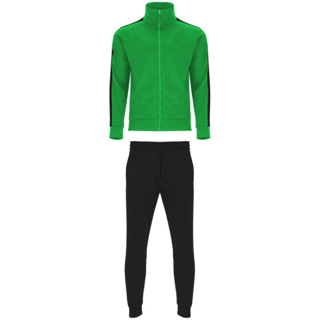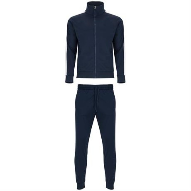 Tuta composta da giacca e pantalone:1. Collo alto con copri cuciture interne in tinta.2. Collo, polsini e girovita in costina 1x1.3. Cerniera centrale in tinta con tiretto.4. Tasche laterali della giacca con cerniera.5. Fascia laterale in contrasto.6. Pantalone con girovita elastico e cordoni regolabili.7. Due tasche laterali.8. Tasca posteriore con cerniera.9. Pantaloni con caviglie elasticizzate in costina 1x1.
