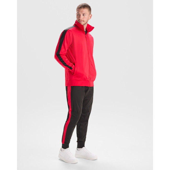 Tuta classica garzata con fasce a contrasto. Giacca a collo alto con scollo nastrato. Chiusura frontale con zip e tiralampo. Tasche laterali con chiusura a zip nelle taglie da adulto. Colletto, polsini e vita a coste 1x1. Pantalone con girovita elasticizzato e cordoncino regolabile. Tasche laterali e una tasca con zip sul retro. Pannello laterale in colore a contrasto. Polsini a coste 1x1.