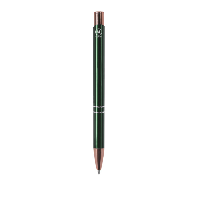 Penna a pulsante fatta di alluminio riciclato. Include accessori argentati e pinza, pulsante e punta in finitura oro rosa. Inchiostro blu. Alluminio riciclato distintivo sulla sommità della penna.