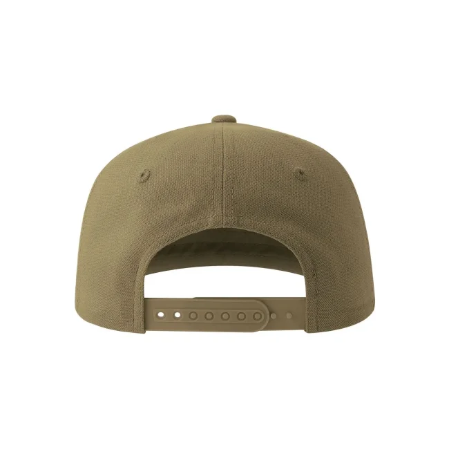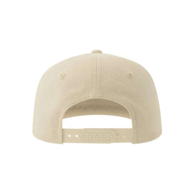 100% cotone canvas organico. Cappello a 5 pannelli in cotone organico e riciclato, con visiera piatta e chiusura snapback in pvc, etichetta removibile.