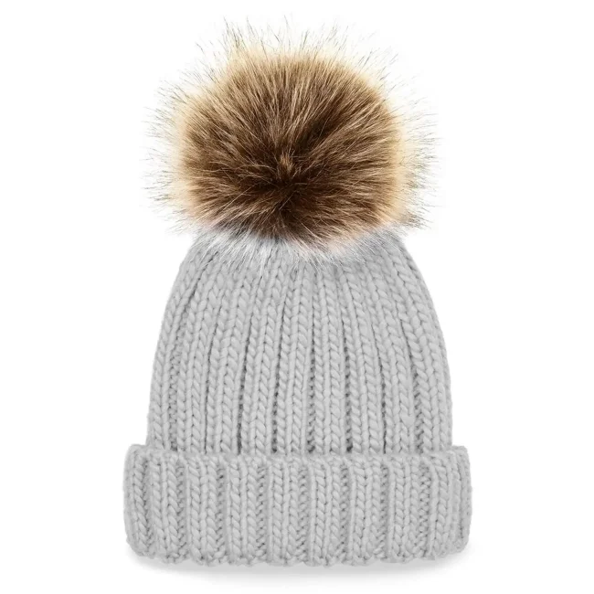 Cuffia unisex in coste di filato pesante, realizzata in acrilico soft-spun al 100%. Il design con risvolto e il pon-pon in pelliccia ecologica rimovibile la rendono versatile e comoda, mentre la taglia unica garantisce una vestibilità adatta a tutti.