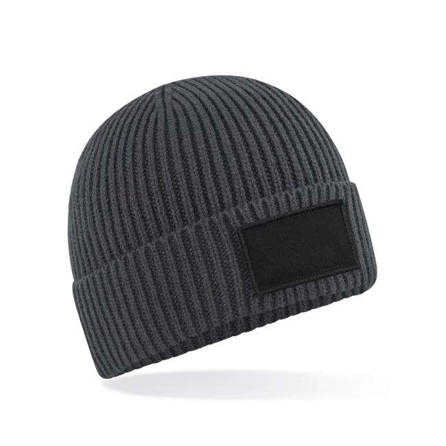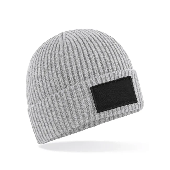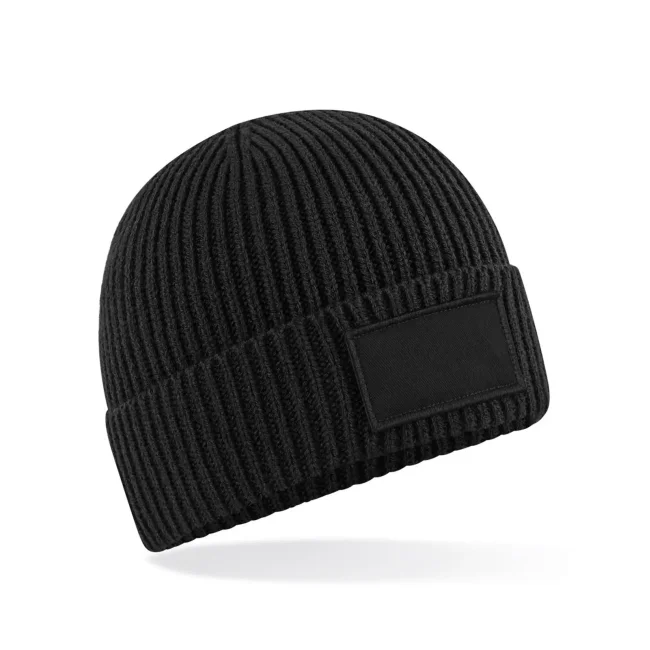 La cuffia Fashion Patch è realizzata con una miscela di 52% poliestere riciclato, 47% acrilico e 1% elastan. Il design a costine e la toppa in twill di cotone offrono un tocco distintivo, mentre il risvolto garantisce comfort e stile. L'etichetta removibile facilita il rebranding.