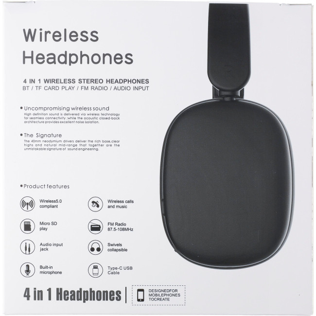 Cuffie wireless in ABS con batteria da 250 mAh, connessione Type-C, tempo di riproduzione di circa 10 ore, con un tempo di standby di circa 200 ore, il tempo di ricarica è di 2 ore circa, dispone di radio FM, inserimento della scheda TD e tecnologia di connessione wireless 5.3, gamma di frequenza: 20-20.000 Hz. 32 Ohm, potenza in decibel: 105 dB ± 3 dB, distanza funzionamento wireless: 10-20 metri, include cavo per la ricarica e manuale, confezionato singolarmente in scatola regalo