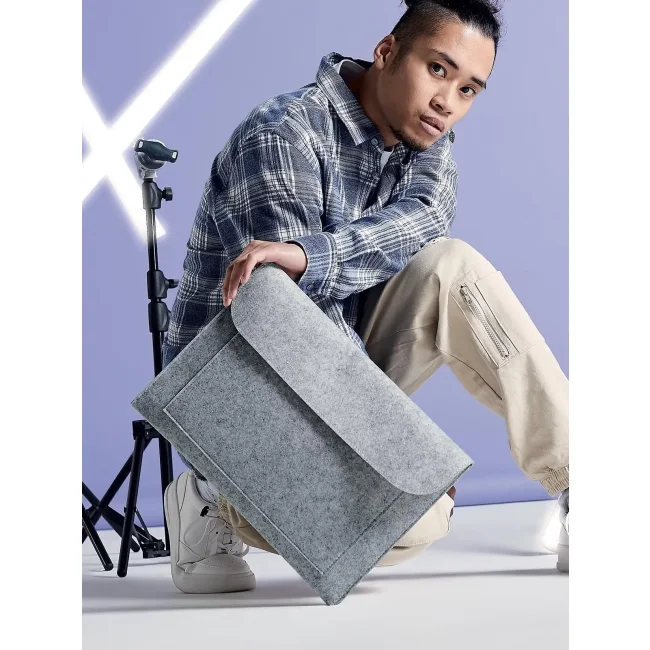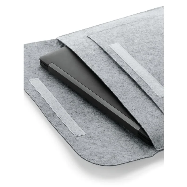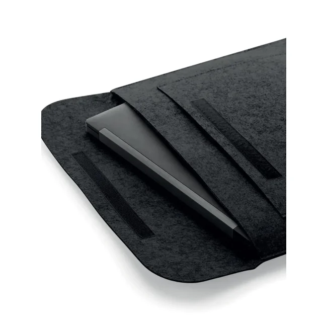 Custodia per laptop realizzata in 100% poliestere feltro, progettata per contenere laptop fino a 15.6" e documenti di dimensione A4. Dotata di tasca frontale e chiusura a strappo, le dimensioni sono 41.5x28 cm con un'area stampabile di 28x11 cm, ideale per personalizzazioni aziendali.