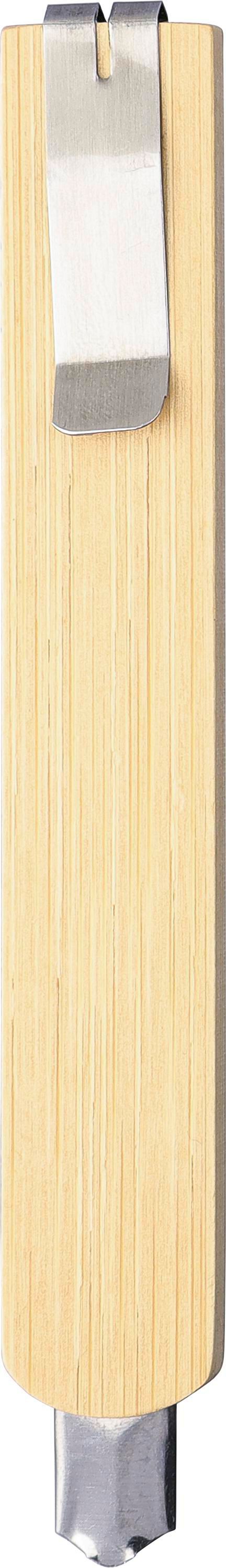 Cutter in metallo con corpo in bambù e le lame in acciaio al carbonio, presenta clip in metallo sul retro per fissare la lama quando non viene utilizzata, confezionato singolarmente in sacchetto di plastica riciclata