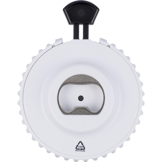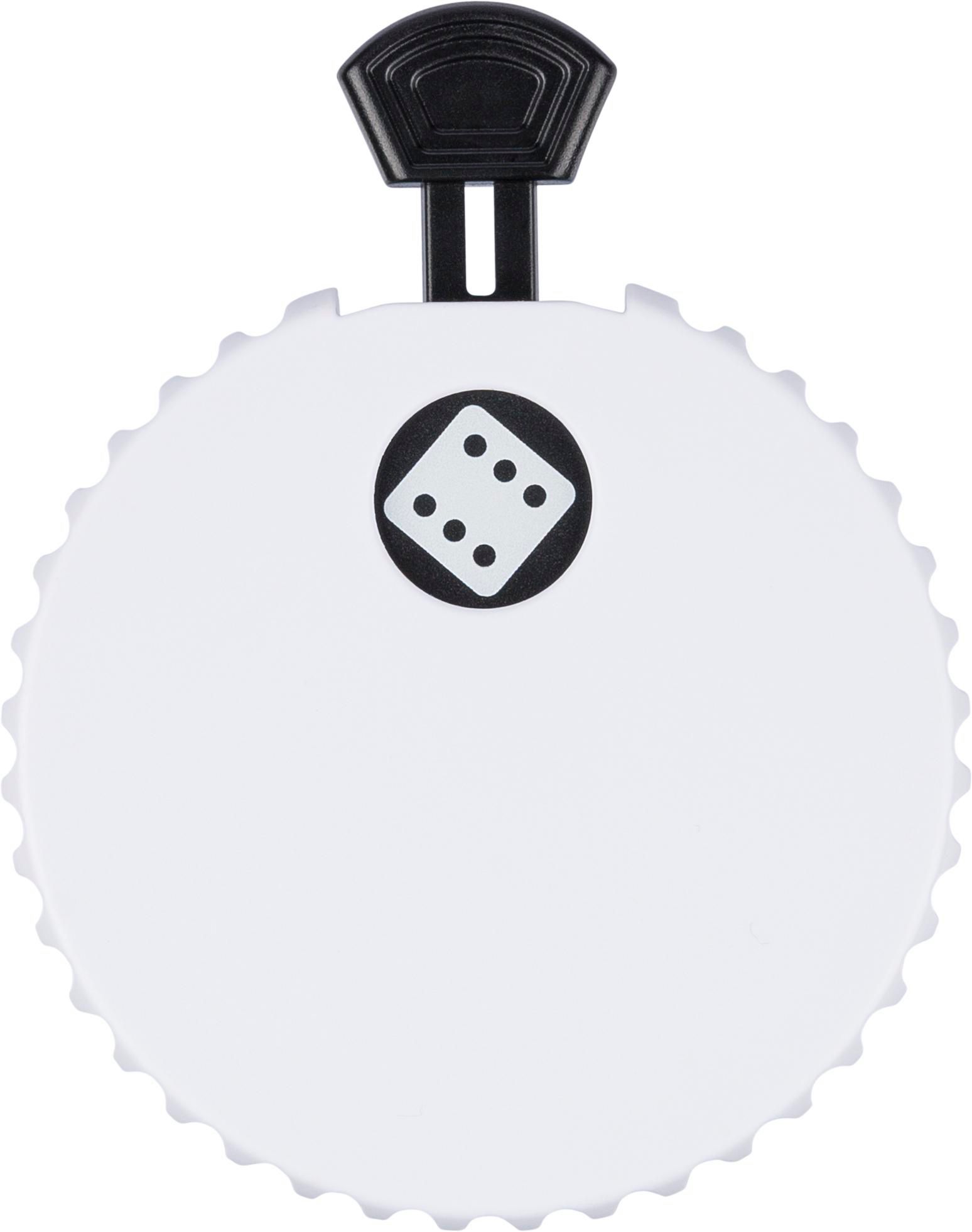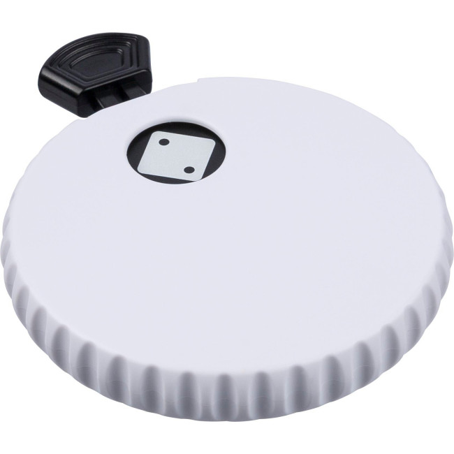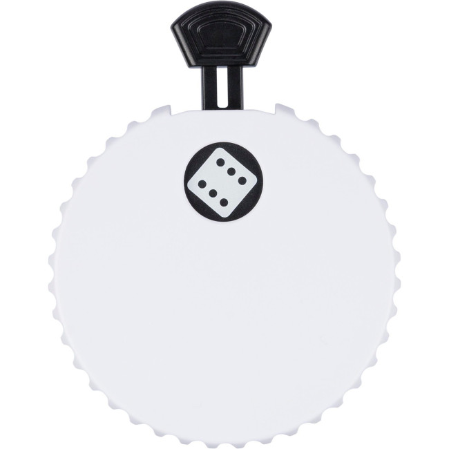 Dado meccanico in ABS riciclato con pulsante sulla parte superiore, nel premere permette di far girare il meccanismo interno e rivelare un numero casuale da 1 a 6, include un apribottiglie sul retro e un piccolo logo in "ABS riciclato", confezionato in polybag riciclato.