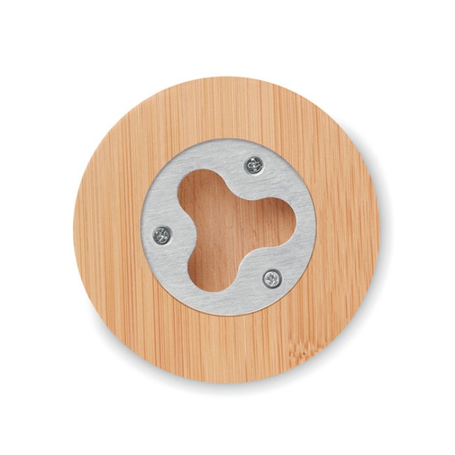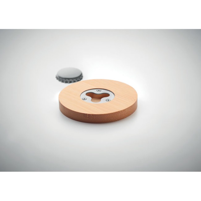 Apribottiglie di bamboo con funzione di sottobicchiere. Il bamboo è un materiale naturale, potrebbero esserci lievi variazioni di colore e dimensioni tra un articolo e l'altro, che possono influire sul risultato finale della personalizzazione.