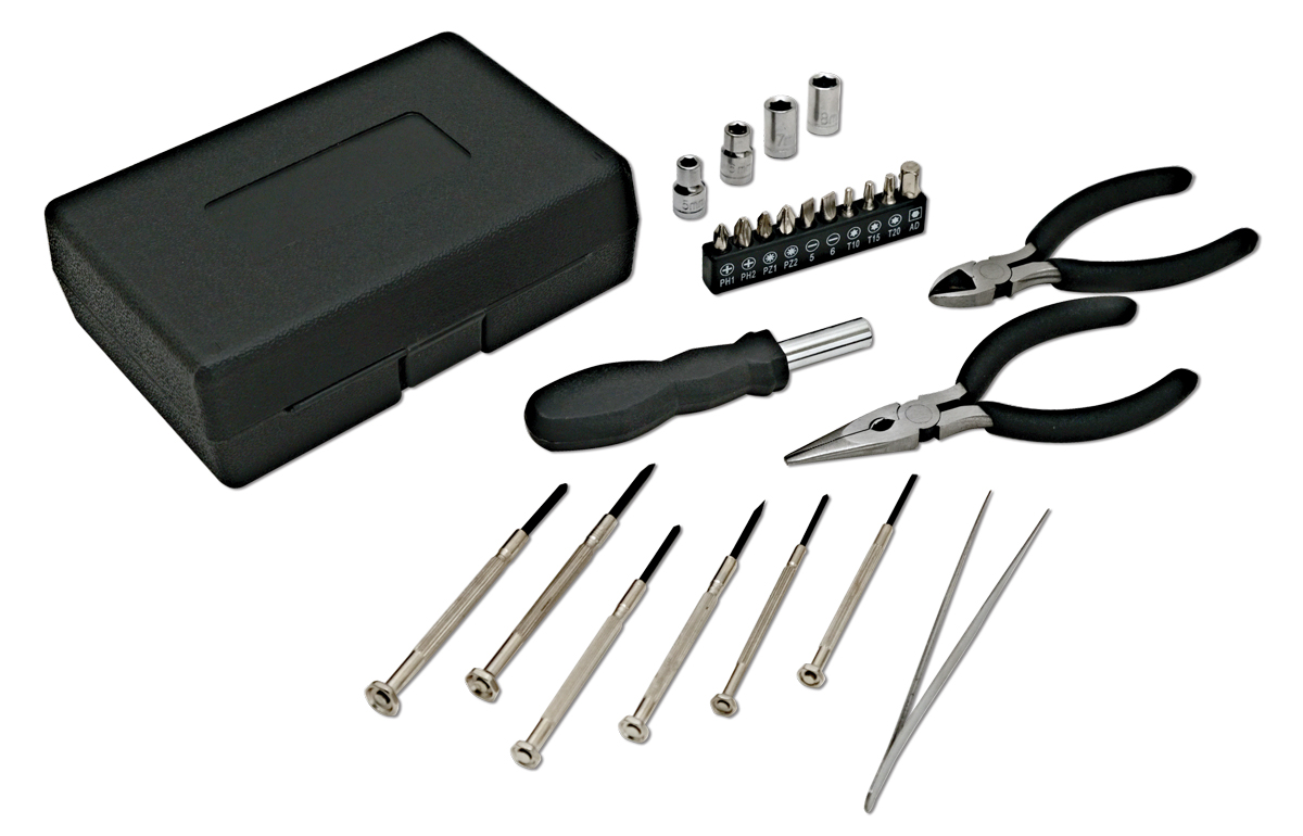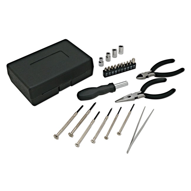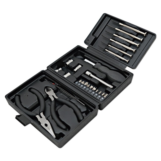 Set attrezzi 25 pezzi, in robusta custodia di plastica a tre ante in silver. Confezione in fascetta bianca.