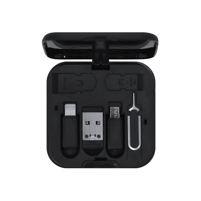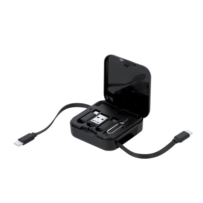 Set di cavi di ricarica per il tuo smartphone realizzati in ABS riciclato (RABS). Dispone di un cavo di ricarica rapida retrattile da 100 cm e trasferimento dati USB-C da 100W, insieme a un adattatore USB-A e un adattatore microUSB/Lightning 2-in-1. RABS è una plastica altamente riciclabile con grande resistenza e molteplici applicazioni che lo rendono una soluzione ecologica. All'interno troverai un espulsore per la SIM, un spazio per una nano SIM e una SIM, e un portatelefono integrato, perfetto per guardare video o fare videochiamate. Facile da trasportare grazie al suo design compatto.