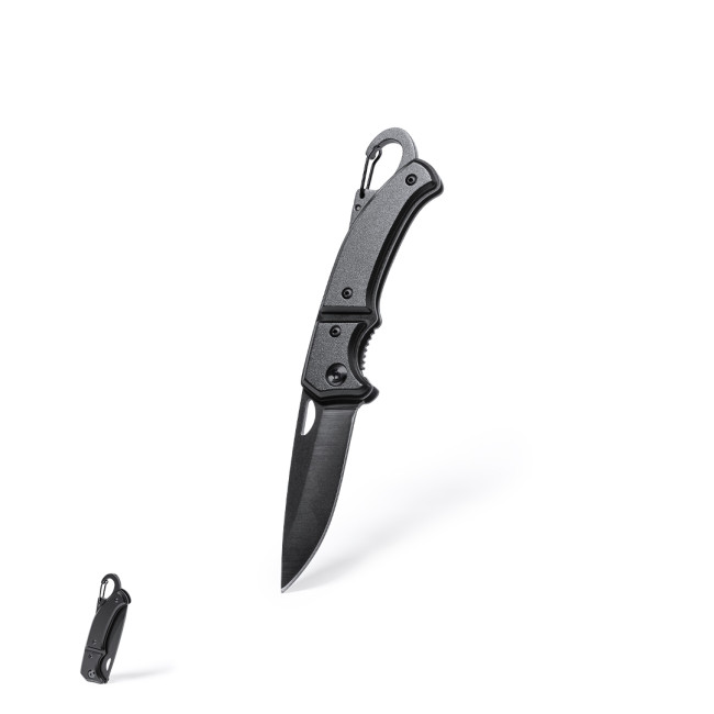 Coltello con lama in acciaio inox con finitura nera e manico in alluminio robusto abbinato. Con moschettone integrato nell'impugnatura e chiusura di sicurezza. Con lama fustellata per una facile apertura e confezionato in una scatola di design nera.