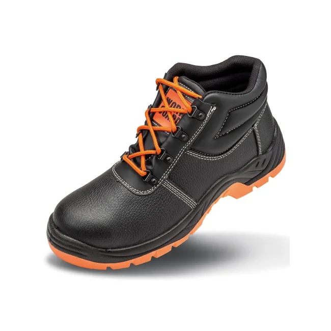 100% pelle. Scarpe con collo imbottito, fodera nera in rete all'interno della caviglia, occhielli neri, punta e intersuola in acciaio, suola in poliuretano color arancione/nero, lacci nero/arancione e due supplementari set di ricambio (uno arancione e uno nero). EN ISO 20345:2011 S1P SRA.