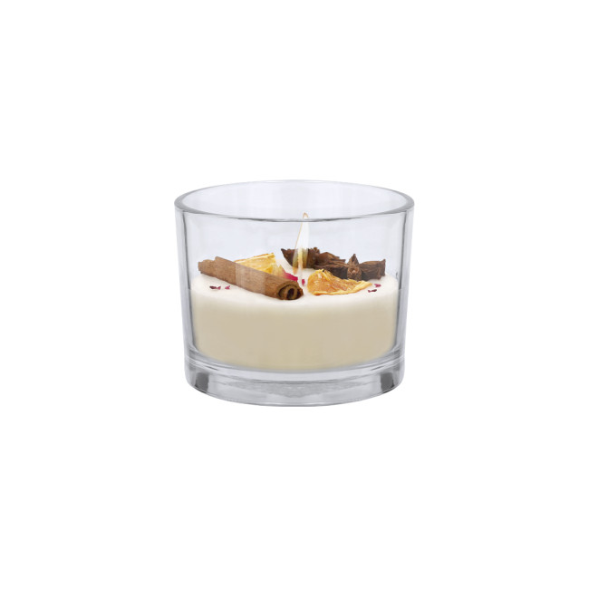 Candela aromatica realizzata con cera vegetale e fragranza di cannella e agrumi. Decorata nella parte superiore con petali di fiore rosa, una stecca di cannella, fette di arancia essiccata e anice stellato.