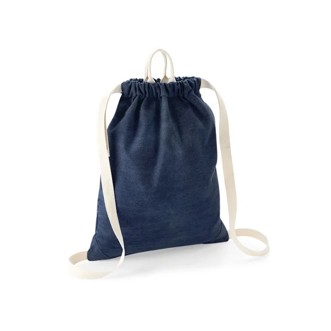 100% miscela cotone e poliestere denim. Sacca con doppio manico, trasportabile a mano o come zaino, chiusura con coulisse, spallacci in cotone. Dimensioni: 46x37 cm, capacità: 12 litri, area stampabile: 16x20 cm.