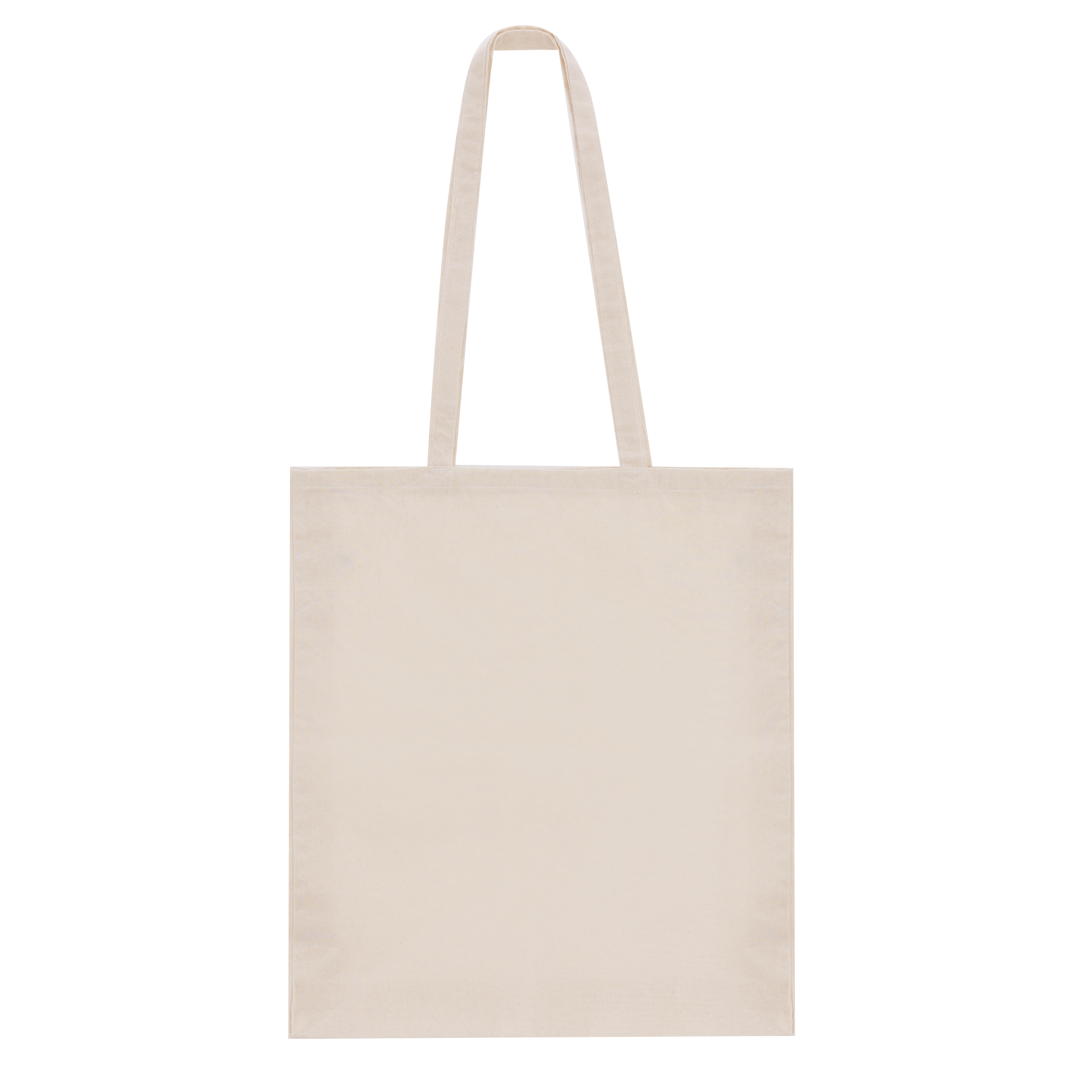 Borsa realizzata in cotone, finitura naturale e 140g/m2. Finiture cucite, con soffietto alla base e lunghi manici rinforzati (70 x 2,5 cm). Resistenza fino a 6 kg di peso.