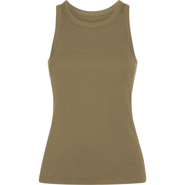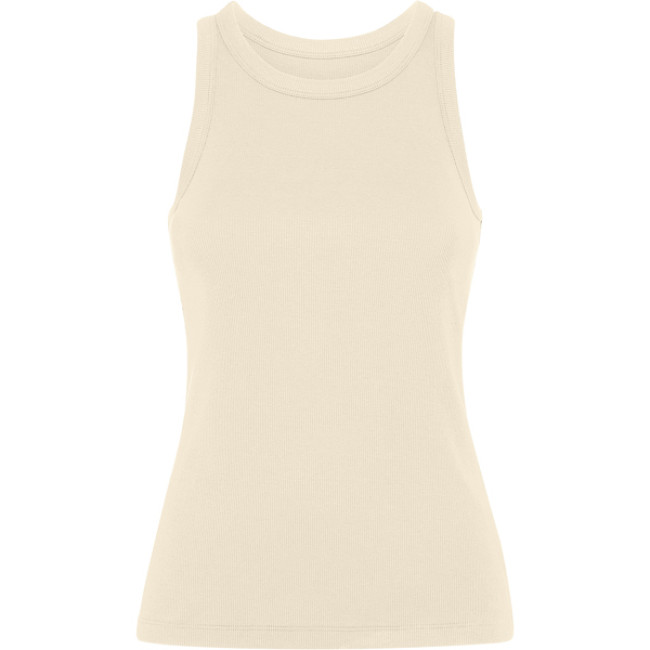 Canotta da donna in maglia a coste. Ampio colletto e giromanica a vivo in tessuto uguale e rinforzato con due cuciture. Doppio orlo cucito.