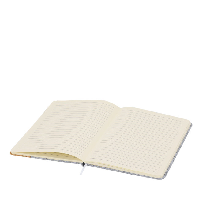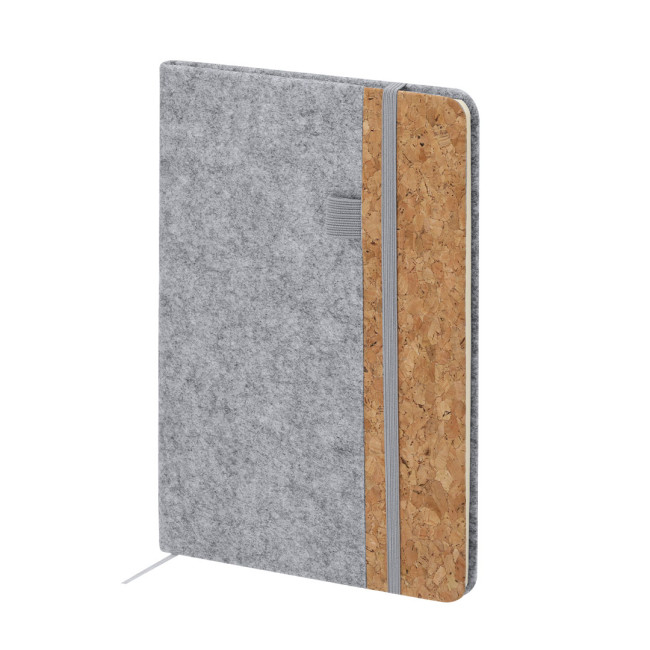 Blocco note con copertine rigide realizzate in combinazione di feltro RPET e sughero. Include 80 fogli a righe con elastico di chiusura per penne sulla copertina, nastro elastico di chiusura e segnalibro a tono. Include distintivo RFELT.Realizzato con elementi vegetali per favorire l'uso di materie prime naturali e ridurre le emissioni inquinanti.Il feltro RPET è il risultato della combinazione del processo di riciclo dei materiali plastici con la tecnica millenaria di produzione del feltro, dando come risultato un materiale di eco-tendenza che, oltre ad essere di origine riciclata, è anche riciclabile.