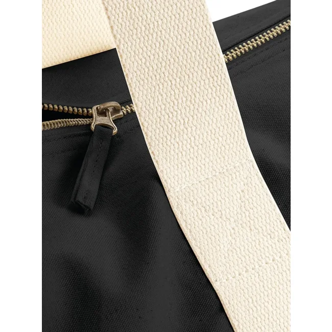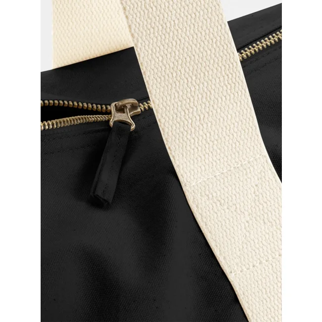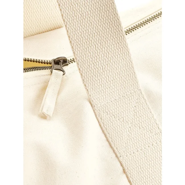 100% cotone organico Canvas. Borsone in tessuto certificato Control Union. Chiusura con zip, manici a tracolla. Etichetta removibile. Dimensioni: 50 x 25 x 25 cm, capacita': 20 litri, area di stampa parte anteriore: 13 x 12 cm, estremita': 15 x 15 cm.