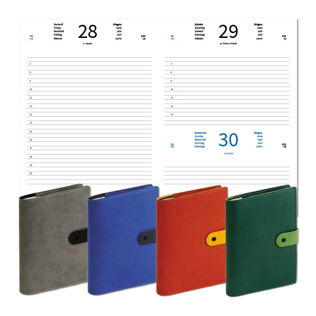 Agenda giornaliera a portafoglio con sabato e domenica abbinati. Carta bianca certificata FSC da 60 gr, 320 pagine.