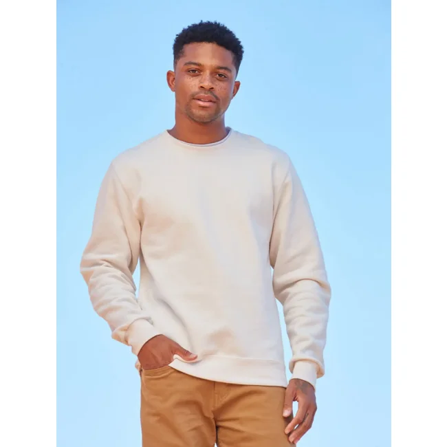57% cotone 43% poliestere riciclato. Felpa girocollo con maniche set-in caratterizzata da una morbidezza superiore, realizzata con poliestere riciclato al 100% e cotone coltivato in USA da fonti sostenibili. Molto traspirante per un comfort che dura tutto il giorno. Alta densità di punti per una tela di stampa liscia, colletto, polsini e cintura a costine, cuciture a due aghi su collo, giromanica e cintura, nastratura da spalla a spalla. Etichetta removibile.