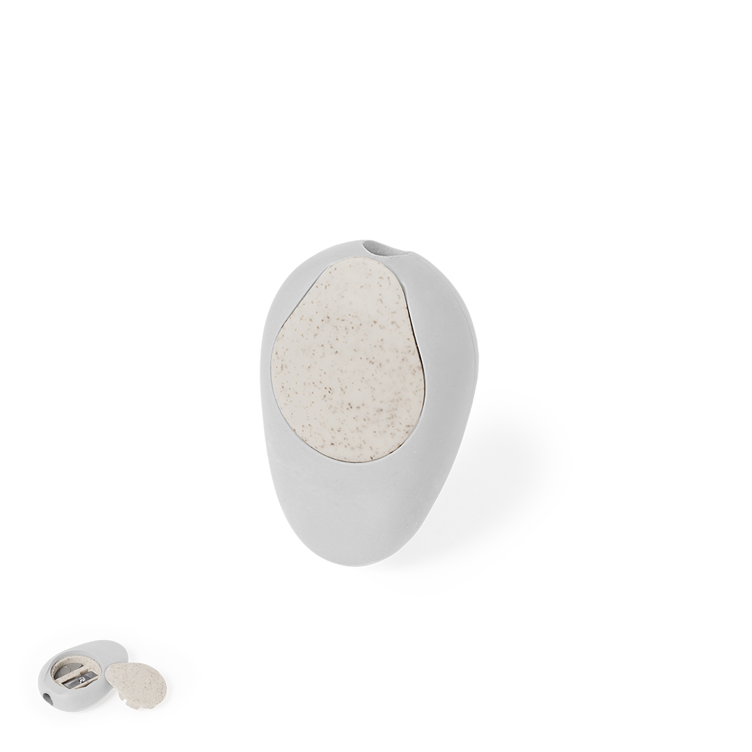 Originale temperamatite in fibra di grano. Pratico temperamatite tascabile a forma di pietra levigata con un pratico coperchio in fibra di grano, comodo da usare e conservare. La fibra di grano favorisce l'utilizzo di materie prime naturali, riducendo così le emissioni inquinanti.