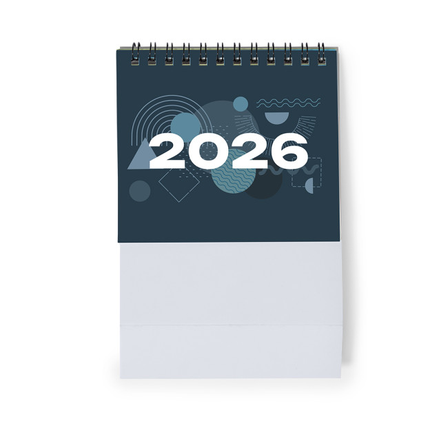 Calendario da tavolo ad anelli, di formato triangolare, in cartone. Design mese in corso/mese precedente/mese successivo e calendario dei giorni santi. Ampia superficie per la stampa su entrambi i lati.