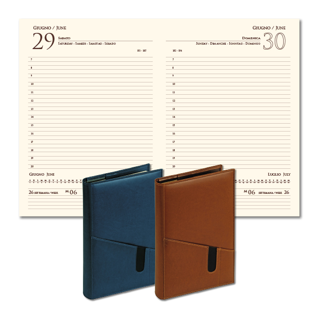 Agenda giornaliera con sabato e domenica separati. Carta avorio certificata FSC da 60 gr, 448 pagine.