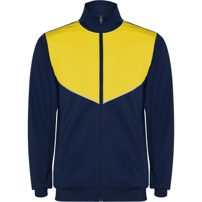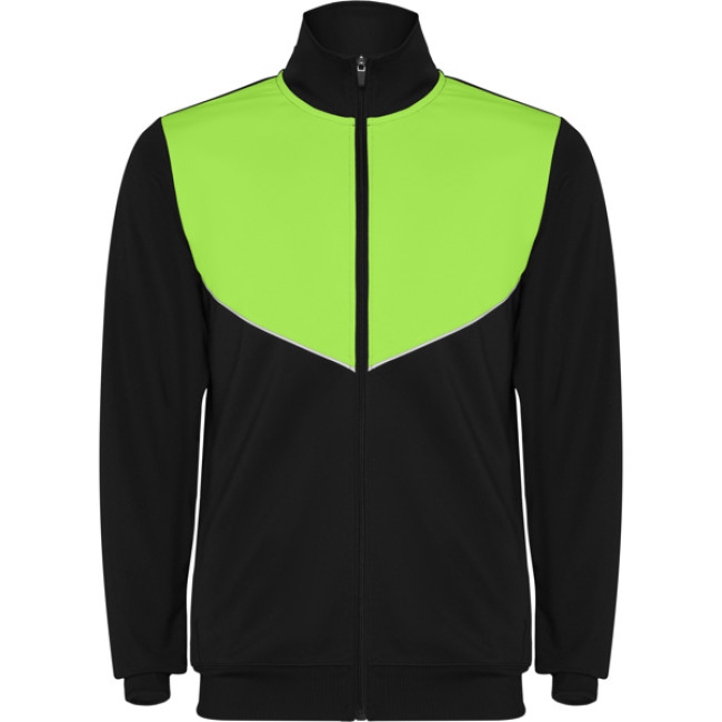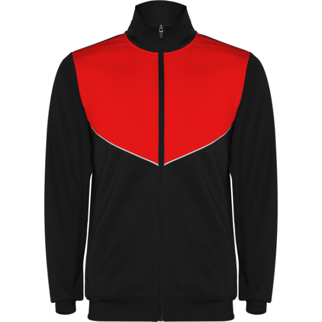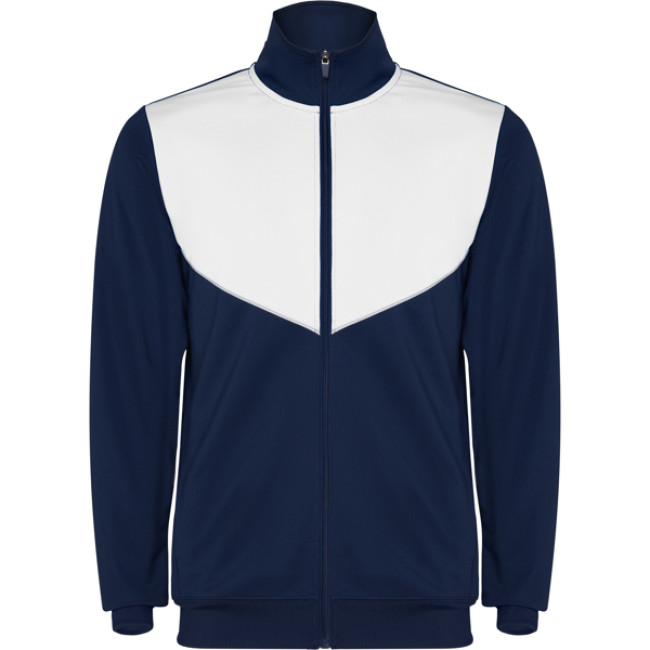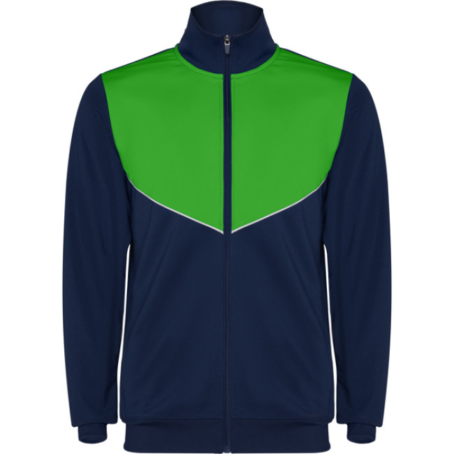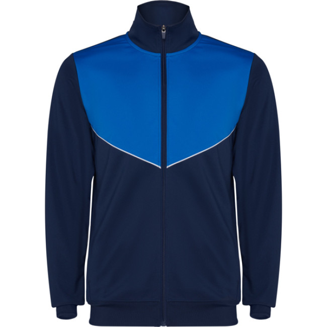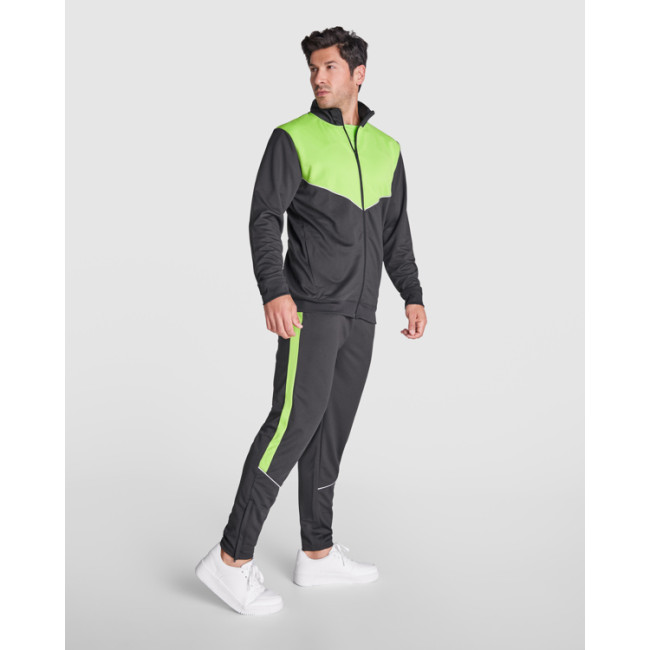Tuta da ginnastica in leggero tessuto elasticizzato.· Giacca con colore a contrasto e cucitura sul petto.· Collo alto con cuciture a contrasto.· Cerniera centrale· Tasche laterali.· Polsini e vita a costine 2x2.· Pantaloni con vita elastica e cordoncino. · Parte laterale a contrasto con bordi di cucitura. · Orlo con cerniera.