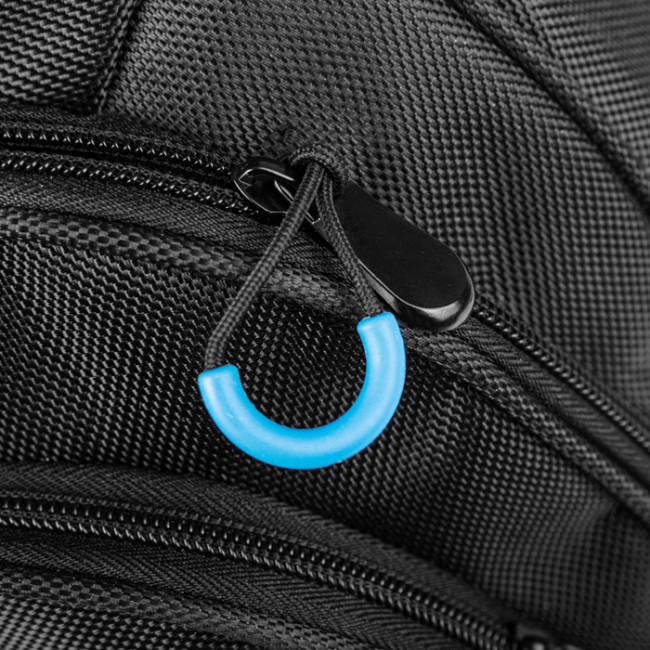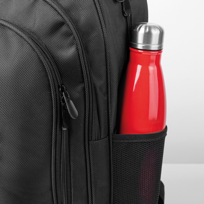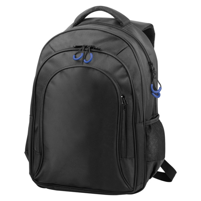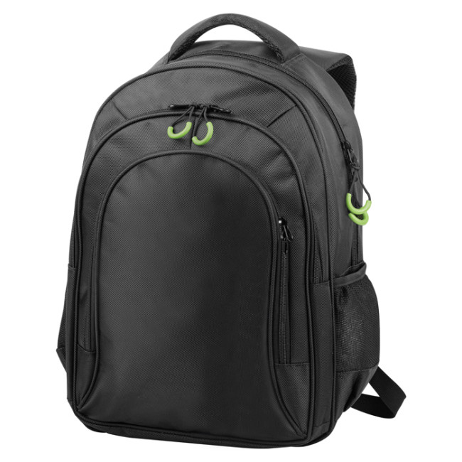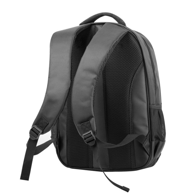 zaino in poliestere 1680d 3 tasche con zip e tiralampo vano interno imbottito porta pc spallacci imbottiti e traspiranti tasche laterali in materiale traforato laptop fino a 15"