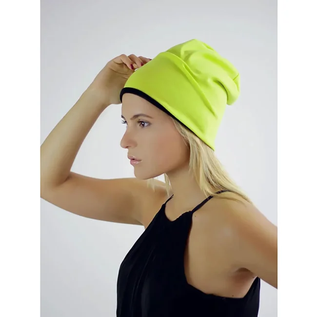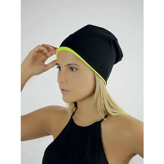 73% poliestere, 23% cotone, 4% elastane. Cuffia, reversibile, etichetta atlantis facilmente rimovibile, doppio strato, 6 cuciture di chiusura.