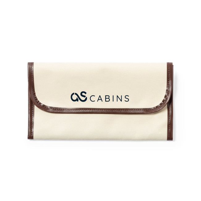 Portadocumenti da viaggio in resistente 600D naturale con finiture e rinforzi in similpelle marrone. Patta con chiusura a velcro e numerosi scomparti interni.