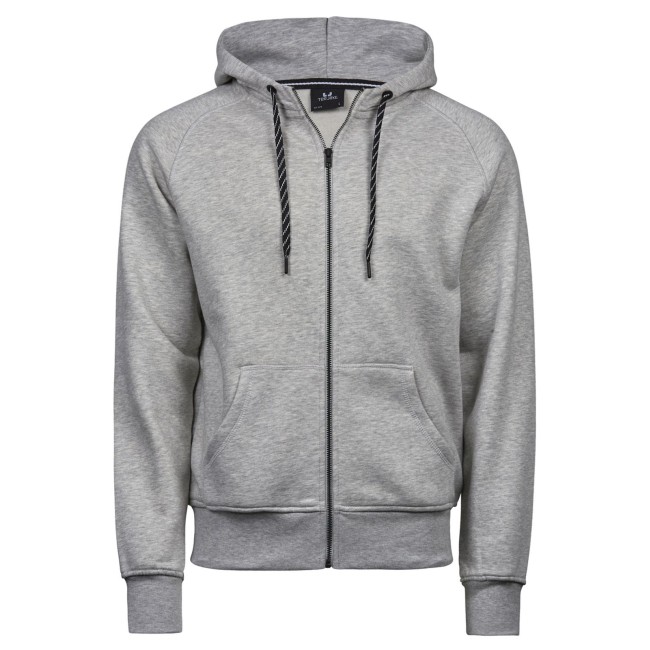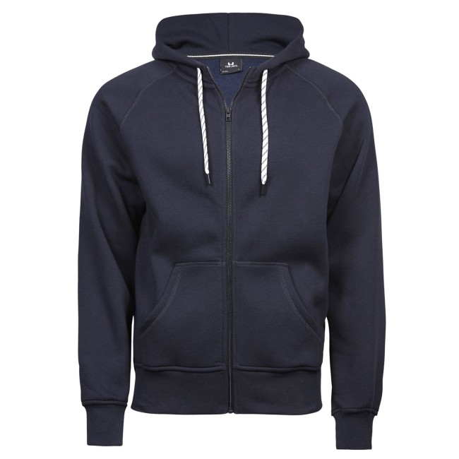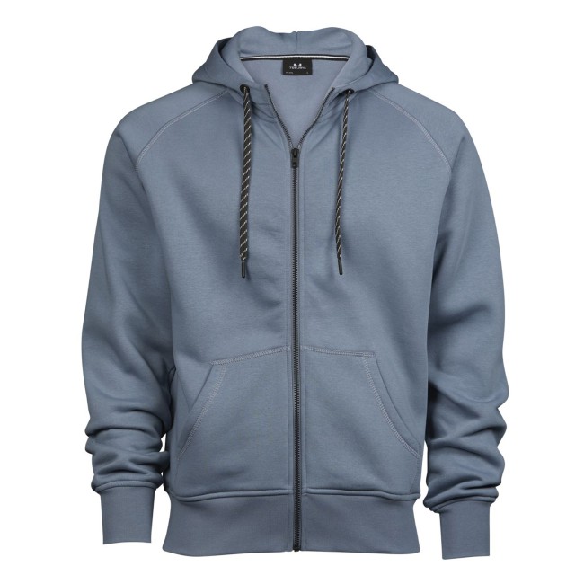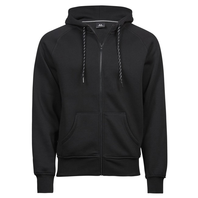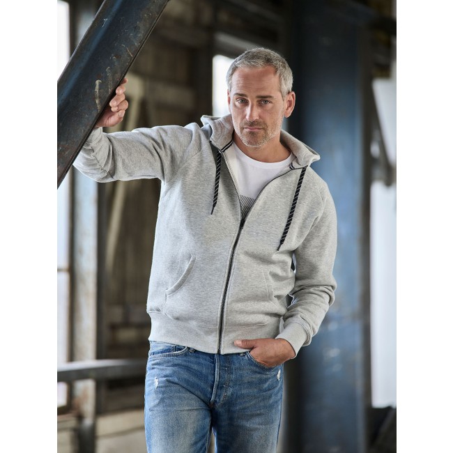 70% cotone ringspun, 30% poliestere. Felpa con maniche raglan, zip intera, cappuccio con cordoncino in contrasto, costina con lycra, doppie cuciture, tessuto in fibra di cotone egiziano, felpata internamente, tessuto a 3 fili, ideale per stampa e ricamo, struttura con cuciture laterali.