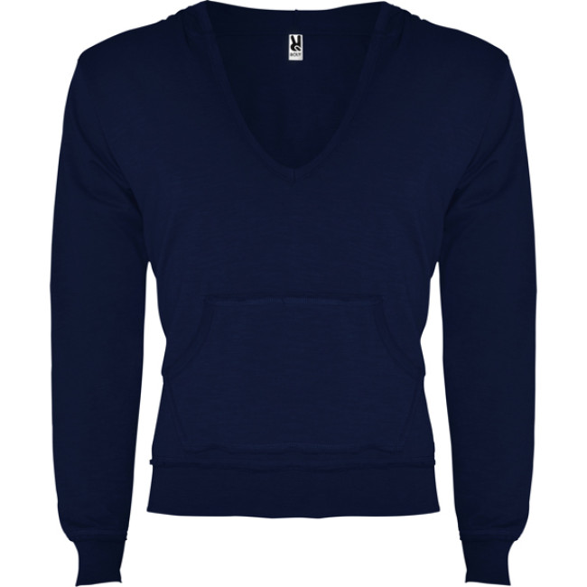 Felpa con cappuccio e scollatura a V, progettata per un look moderno e casual. Presenta una tasca a marsupio e polsini in costina con decorazione effetto usato. Realizzata per garantire comfort e praticità, è personalizzabile con logo per un tocco distintivo.