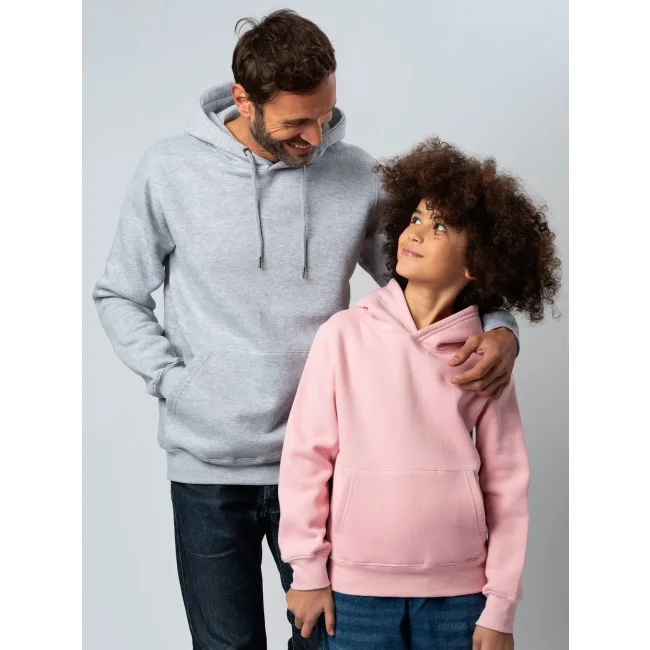 70% cotone, 30% poliestere. Felpa con maniche set-in, unisex, felpata internamente, cappuccio a doppio strato, occhielli in metallo, cordini con punta in metallo, grande tasca a marsupio, struttura con cuciture laterali, fascia in vita e polsini in costina. Etichetta strappabile. Interno in poliestere ed esterno 100% cotone.