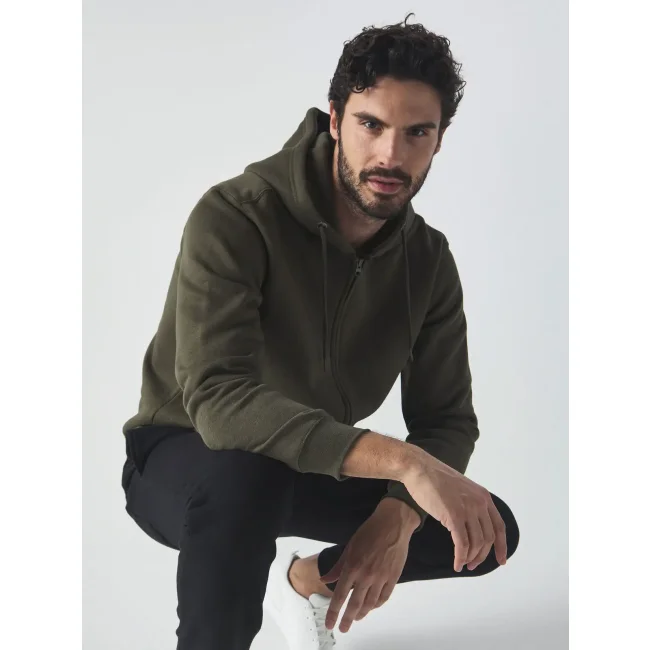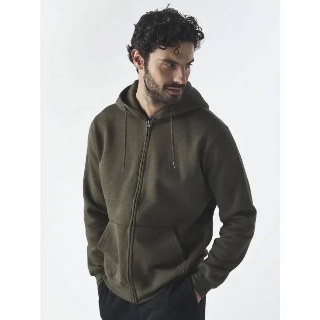 70% cotone, 30% poliestere. Felpa con cappuccio a doppio strato, felpata internamente, maniche set-in, cerniera tono su tono coperta, occhielli in metallo, cordini con punta in metallo, tasca a marsupio, orlo inferiore e polsini in costina, struttura con cuciture laterali. Etichetta strappabile. Interno in poliestere ed esterno 100% cotone.