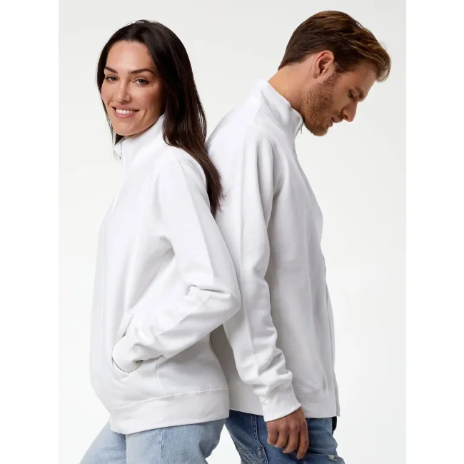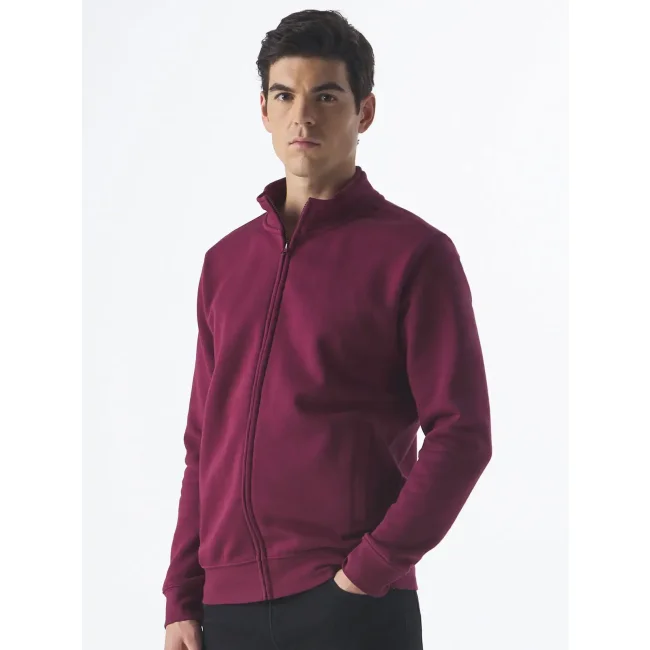 70% cotone, 30% poliestere. Felpa con maniche set-in, felpata internamente, zip intera, tasche a filetto, orlo inferiore e polsini con costina, struttura con cuciture laterali. Etichetta strappabile. Interno in poliestere ed esterno 100% cotone.