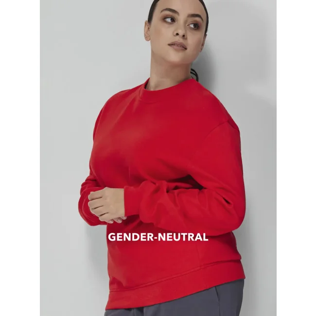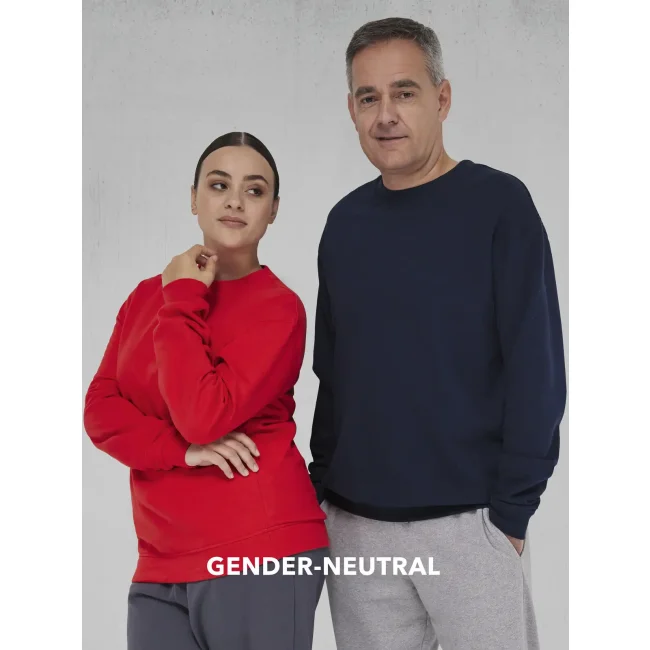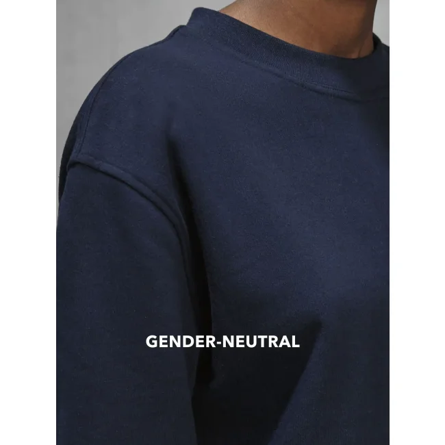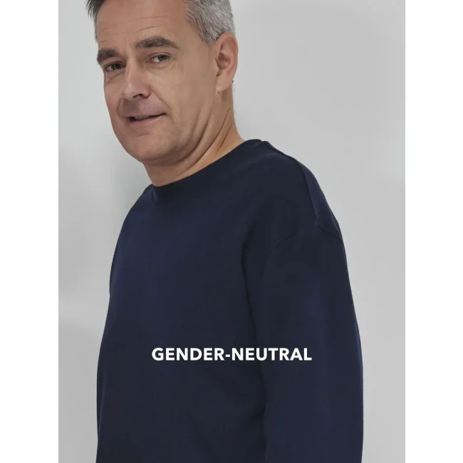 Felpa girocollo sostenibile in cotone e poliestere riciclato, caratterizzata da una vestibilità rilassata e polsini classici. Il collo privo di etichette è perfetto per la personalizzazione, mentre l'interno felpato garantisce comfort. Un capo versatile per ogni occasione.