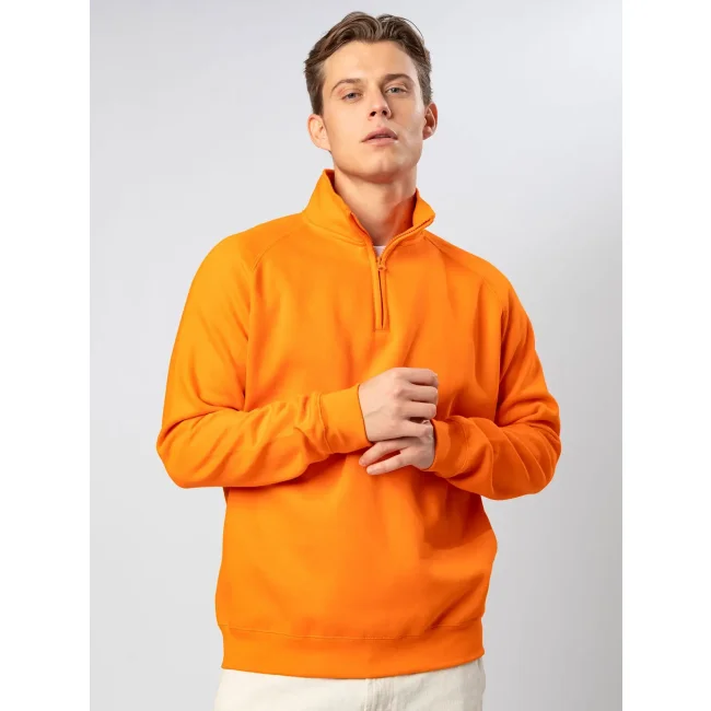 70% cotone, 30% poliestere. Felpa con maniche raglan, zip ¼ coperta, felpata internamente, struttura con cuciture laterali. Etichetta strappabile. Interno in poliestere ed esterno in 100% cotone.