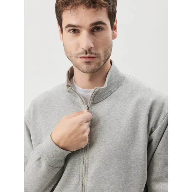 Felpa full zip realizzata in cotone riciclato e poliestere riciclato, con manica dritta e felpata internamente. Dotata di cerniera in plastica e tirazip in metallo, presenta cuciture laterali per una vestibilità comoda. Prodotta in Italia, è ideale per chi cerca un abbigliamento sostenibile e funzionale.