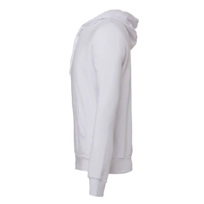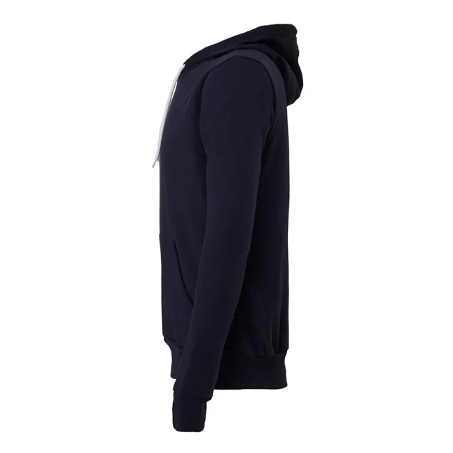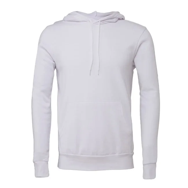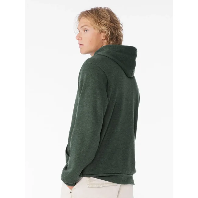 Felpa unisex Sponge Fleece Pullover Hoodie composta da cotone ring-spun e poliestere. Presenta un cappuccio con cordoncino a contrasto, tasche a marsupio e polsini in costina. La vestibilità unisex e l'etichetta removibile la rendono versatile. Disponibile in diverse varianti di colore, con una composizione che varia a seconda della tonalità.