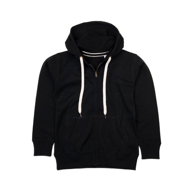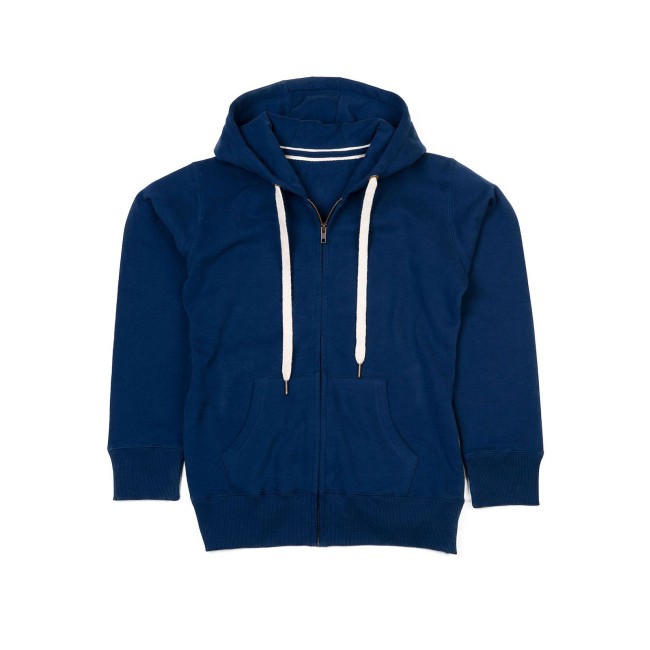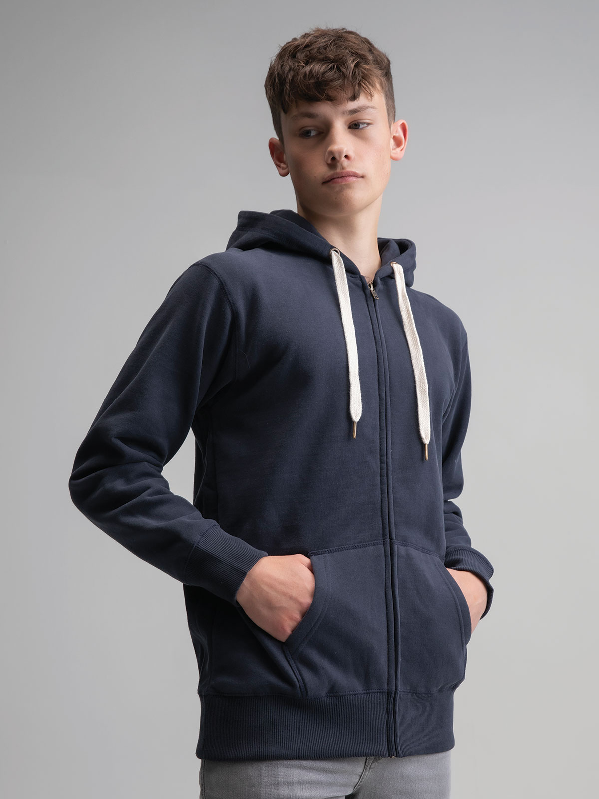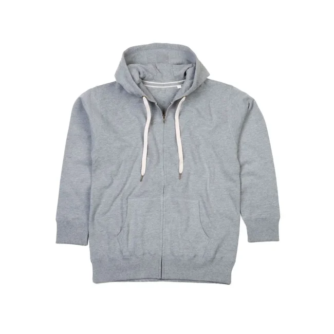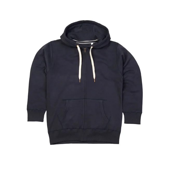 80% cotone 20% poliestere. Felpa con maniche set-in, tasca a marsupio, orlo inferiore e polsini in costina, nastro di rinforzo al collo, cerniera, cappuccio con cordoncino piatto di colore contrastante con occhielli e estremità del cordino ad effetto ottone. Etichetta strappabile, felpata internamente, struttura con cuciture laterali.