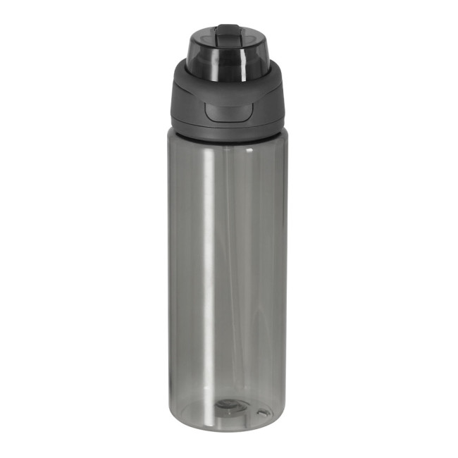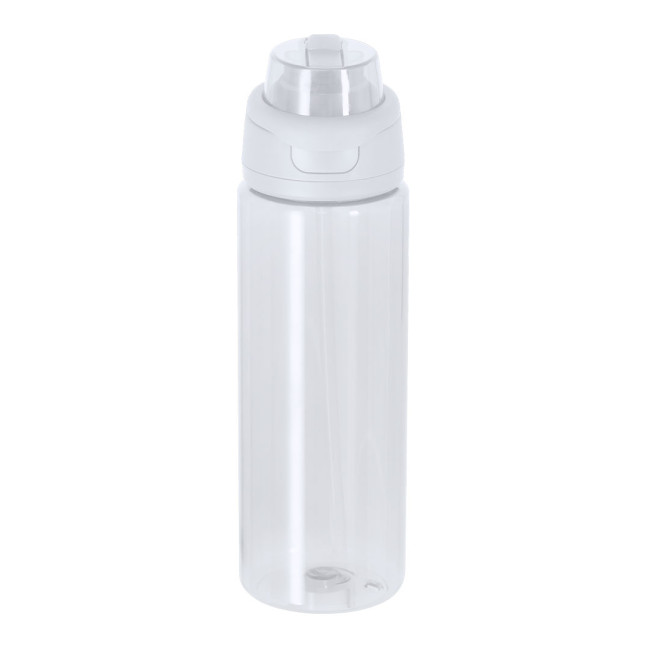 Bottiglia con capacità di 750 ml, realizzata in RPET resistente e con finitura traslucida. Con doppio sistema di bere, cannuccia e buca per bere. Coperchio di chiusura a spinta e maniglia pieghevole. Senza BPA.